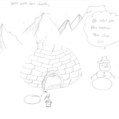 "L'igloo cet endroit qui me cache de toute douleur. Cet maison où je me sens proteger. Ces murs en glace et ses fenêtre me craient un monde nouveau. Ces nuages aussi noire que la nuit cache mon soleil, cet iglou est tellement parfaite qu'elle me protège de la pluie. Cet igloo si belle et si fantastique qu'elle m'éloigne de la douleur de la culpabilité. Cet igloo si magnifique qu'elle me protège des méchants. Cet igloo si protectrice qu'elle me protège des pires accusations." –Elie
