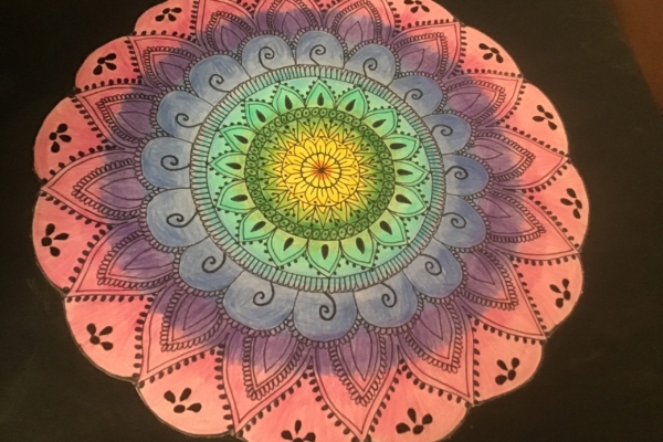 "Ce dessin me fait rappeler d’une nuit sombre avec des feux brillants. Ce symbole pourrait être utilisé dans le henné et le tatouage. Mon dessin est une lune accompagnée de plein de fleurs. Ce dessin était inspiré d’un de mes cours d’art. C’était un mandala. En tout cas, je suis très fière de mon dessin." –Marois