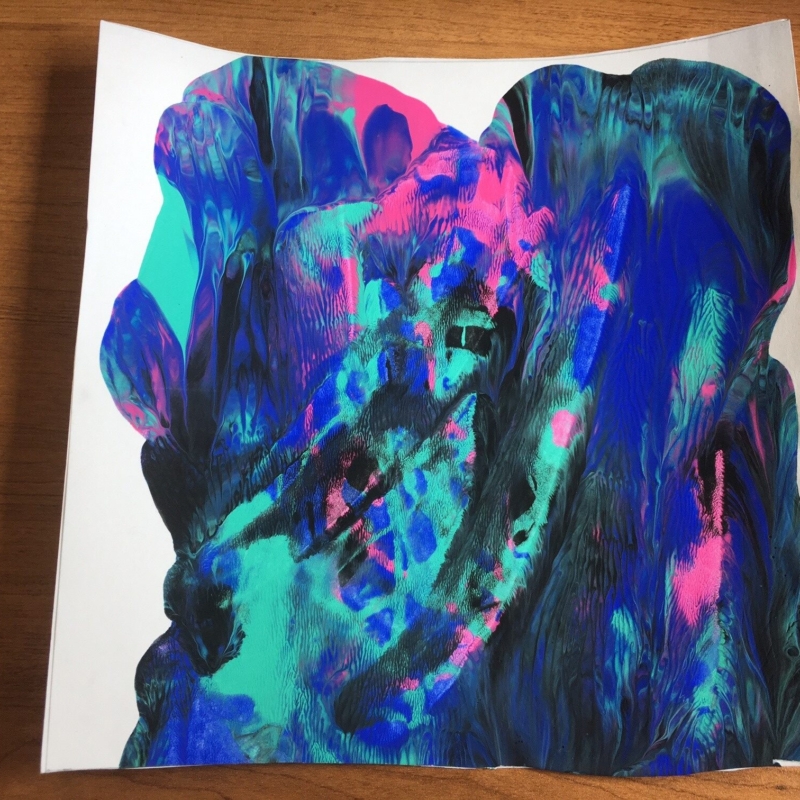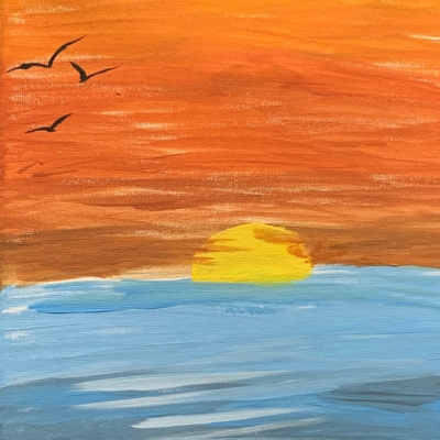 "Ce dessin me fait penser à Noël. Grâce aux couleur rouge et orange qui font penser aux bas de Noël. Ce dessin représente les différentes couleurs de Noël en étant mélangées. Pour ce dessin j’ai utilisé de la peinture, car c’est moins long à faire que de dessiner et tu peux mieux mélanger les couleurs pour qu’elles se mélangent bien." –Audrey