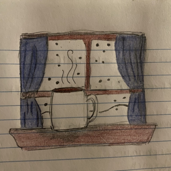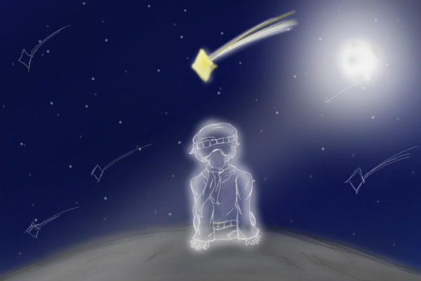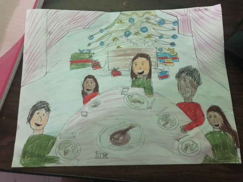 "Since the holiday season is begging, I decided to make something relating to that. I used lots of colours to represent that fun and bright feeling you get during the holidays. As you can see the little boy in the picture doesn't look too happy, the boy represents, how even though people around us and the atmosphere may seem happy not everyone in that space is. The rabbit beside the boy represents how he's young, innocent, and pure. I drew a window, so you could see outside and get a better sense of what the weather is like. " –Nevaeh