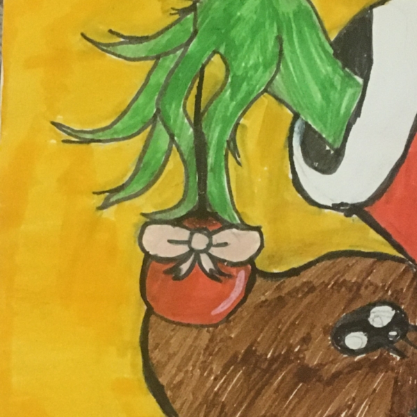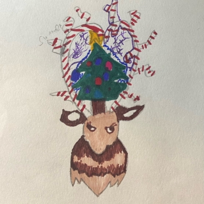 "Voici mon dessin dans celui-ci il y a deux éléments principaux. Le premier est un renne au nez rouge. Le renne se trouve sur une colline de neige. Il est souriant et a de belles pomettes rose framboise. Son nez, comme l'indique son nom, est un rouge vif et le rend encore plus mignon. Ensuite, il y a un petit collier rouge avec des grolots or. Ses oreilles ressemblent un peu a celles d'un chat. Puis, ses bois sont grands et d'un brun foncé. Le deuxième élément de mon dessin est un guirlande rouge et des boules bleus et mauves. Finalement, il y a une tombée de flocons et un beau message chaleureux ''joyeux noël'' en vert forêt." –Audrey