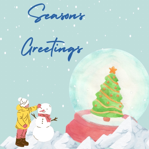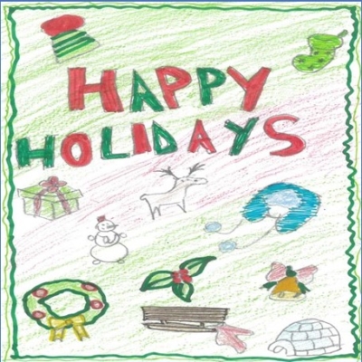 "My submission is a snowman in the snow with snowflakes falling from the sky. There is a little bit of writing that says, "happy holidays". Since the snowman is outside, I decided to colour the background blue as a representation of the outdoors. Finally the bottom of the card is white because the snowman is on the snow and snow is white. Also, when I think about the holidays, the first thing that comes to my mind is the snowman." –Javeen