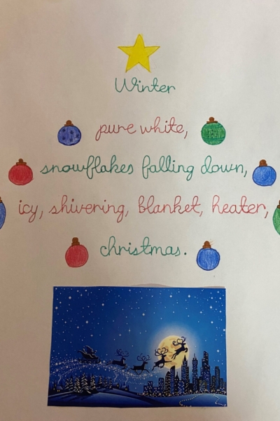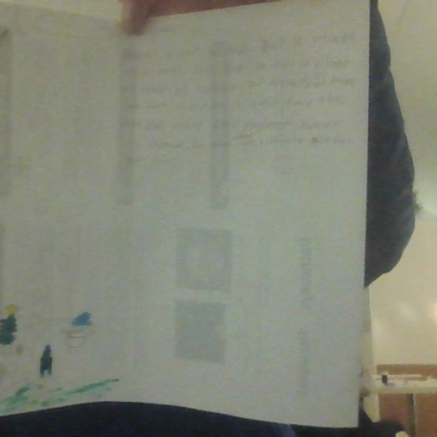 "Il y a un tres beau paysage de neige vert. Il y a beaucoup de sapins. Tous le monde sont content. Il y a un bonhomme de neige d'horreur qui fait peur au pere noel s'il vient donner les cadeaux. Je dis joyeux noel pour tous le monde et bonne fete. Et j'espere de beau cadeau pour tout le monde." –Mohammed