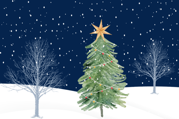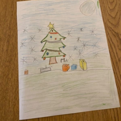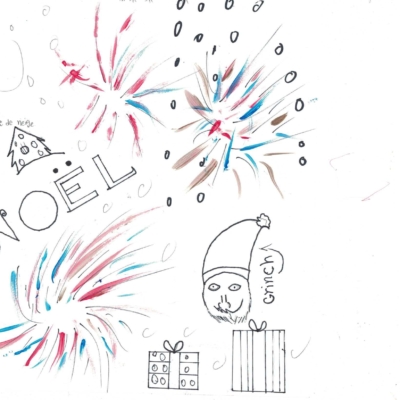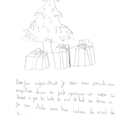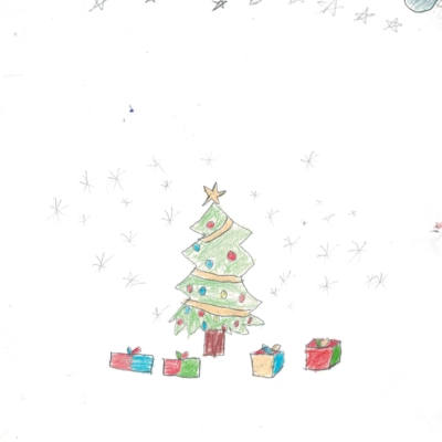 "Mon dessin représente un sapin de Noël qui n’est pas chargé en décoration mais décoré avec des décorations qui représente Noël et qui illumine le cœur de chaque personne qui l’observe. Mon décor est un fond blanc avec des étincelles et des flocons qui représentent la magie de Noël et l’hiver en général. Les cadeaux en dessous du sapin sont là pour chaque enfant qui n’auront pas de cadeaux cette année." –Norah