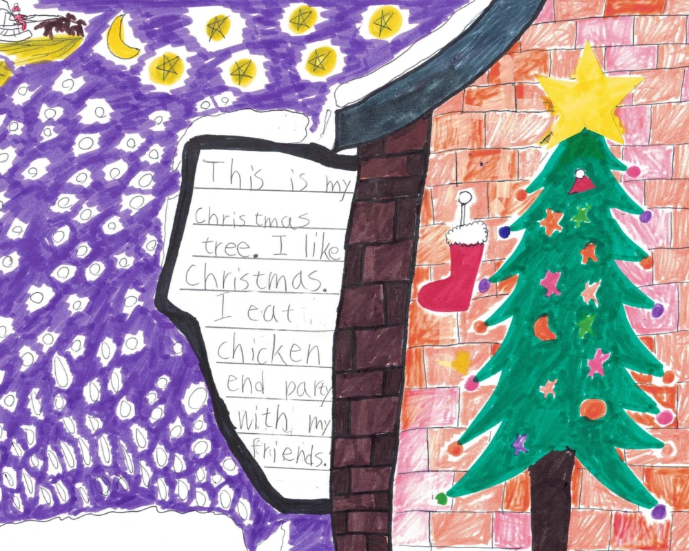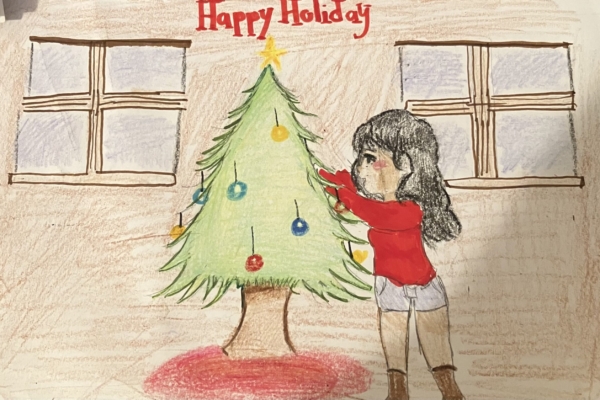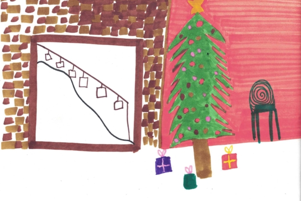 "When I think of the holidays it reminds me of the comfort of my home. So that is why I decided to draw a picture of what my house looks like during Christmas. My house has a beautiful green tree, stockings on the wall and an important snowman painting. Every Christmas my family puts up this snowman painting that was passed down to my parents from my dad's grandparents. Hope you have an amazing Merry Christmas!" –Ajeen