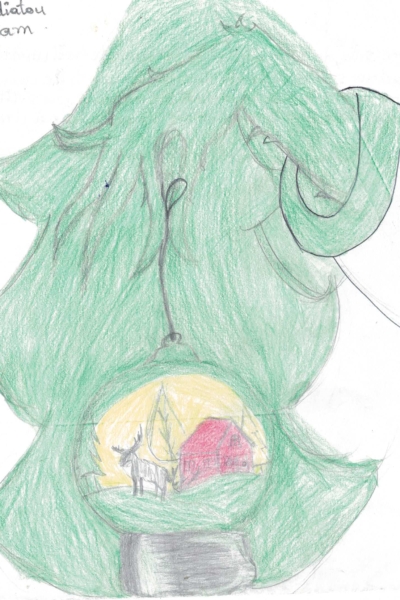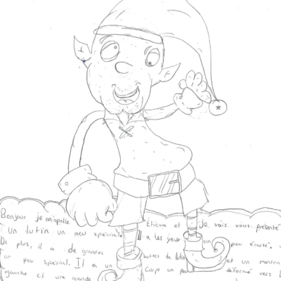 "Pour moi le temps des Fêtes représente un moment magique. Un moment qui m’est précieux! Je trouve que la magie qui est présente un peu partout nous permet d’avoir du plaisir. Le fait de voir des décoration, des lutins, de drôles de créatures de Noël nous permet de vivre dans un monde presqu’imaginaire pendant quelques semaines. C’est pour cela que j’ai fait ce dessin." –Édouard